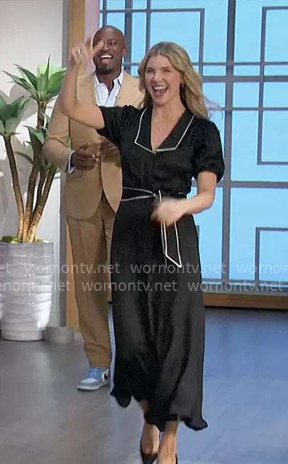 Amanda Kloots on The Talk on CBS was spotted wearing this black midi dress with white piping on The Talk on Jan 29 2024's episode. Amanda's Dress is the The Melody Belted Puff Sleeve Maxi Dress by The Great.