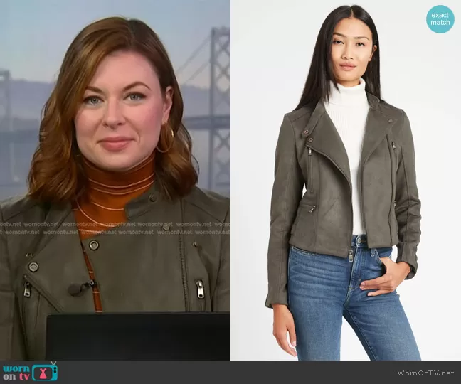 on NBC News Daily on NBC was spotted wearing this Kate Rogers’ suede moto jacket on NBC News Daily on Jan 29 2024's episode. 's Jacket is the Vegan Suede Quilted Biker Jacket by Banana Republic.