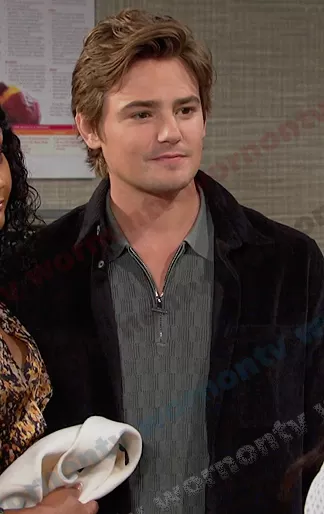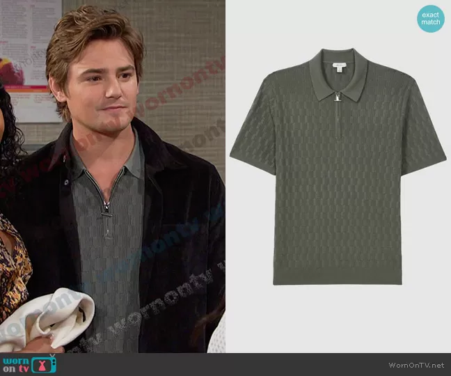 Johnny DiMera (played by Carson Boatman) on Days of our Lives on Peacock was spotted wearing this grey textured polo shirt on Days of our Lives on Jan 30 2024's episode. Johnny's Shirt is the Ubud Polo T-Shirt in Sage Green by Reiss.