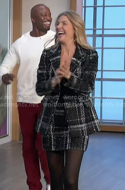 Amanda Kloots on The Talk on CBS was spotted wearing this black plaid tweed blazer and skirt set on The Talk on Jan 30 2024's episode. Amanda's Jacket is the Mia Plaid Tweed Double-Breasted Blazer by Toccin . Amanda's Skirt is the Maris Sequined Plaid Tweed Miniskirt by Toccin.