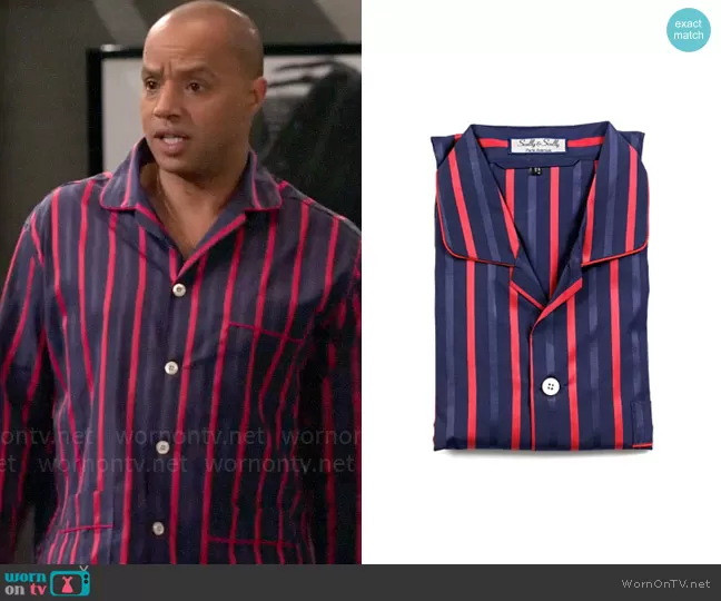 Trey Taylor (played by Donald Faison) on Extended Family on NBC was spotted wearing this striped pajamas on Extended Family on episode 'The Consequences of Status' (1x06) in Jan 2024. Trey's Pajamas is the Striped Soft Cotton Satin Pajamas by Scully & Scully.