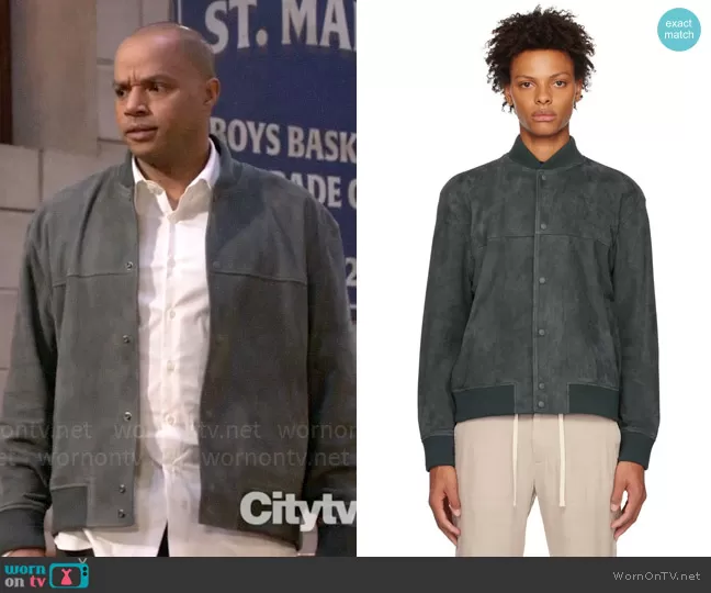 Trey Taylor (played by Donald Faison) on Extended Family on NBC was spotted wearing this grey suede bomber jacket on Extended Family on episode 'The Consequences of Status' (1x06) in Jan 2024. Trey's Jacket is the Coaches Bomber Leather Jacket by Vince.