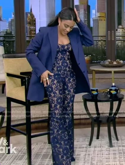 on Live with Kelly and Mark on Disney ABC Home Entertainment was spotted wearing this blue floral lace jumpsuit on Live with Kelly and Mark on Jan 31 2024's episode. 's Jumpsuit is the Lace Flare Jumpsuit by Michael Kors Collection . 's Blazer is the Crepe Sable Boyfriend Blazer Jacket by Michael Kors Collection.