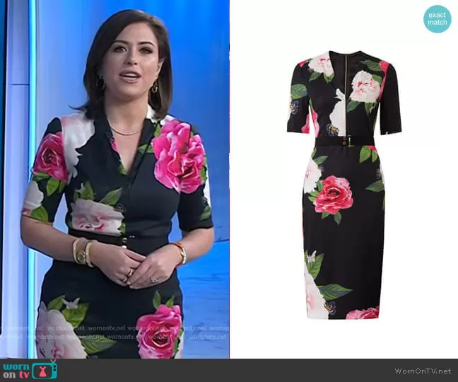 Chloe Melas on Today on NBC was spotted wearing this black floral sheath dress on Today on Jan 31 2024's episode. Chloe's Dress is the Gilanno Dress by Ted Baker.