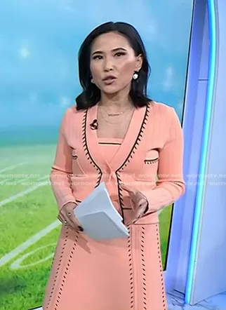 Vicky Nguyen on Today on NBC was spotted wearing this pink embroidered cardigan and skirt on Today on Jan 31 2024's episode. Vicky's Top is the Figari Cropped Knit Camisole by Sandro . Vicky's Sweater is the Embroidered Cardigan by Sandro . Vicky's Skirt is the Eglantine Knit A-Line Mini Skirt by Sandro.