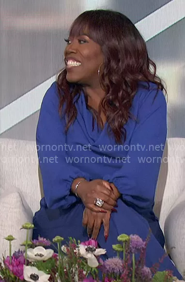 Sheryl Underwood on The Talk on CBS was spotted wearing this blue cowl neck top on The Talk on Jan 31 2024's episode. Sheryl's Top is the Cowl Neck Top by Karen Kane.