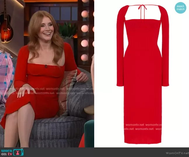 on The Kelly Clarkson Show on NBC was spotted wearing this red ribbed square neck dress on The Kelly Clarkson Show on Feb 01 2024's episode. 's Dress is the Off-The-Shoulder Midi Dress by LaQuan Smith.