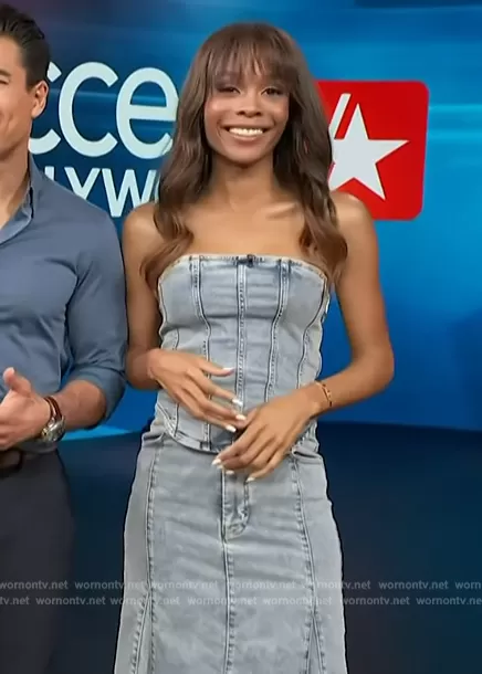 Zuri Hall on Access Hollywood on NBC was spotted wearing this denim corset top and skirt on Access Hollywood on Feb 01 2024's episode. Zuri's Top is the Lustia Strapless Bustier Lace Up Back Top by Maje . Zuri's Skirt is the Justia Denim Skirt by Maje.
