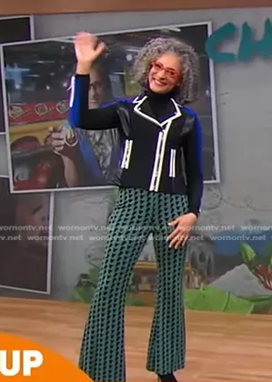 on Good Morning America on ABC was spotted wearing this black colorblock moto jacket and green geometric pants on Good Morning America on Feb 02 2024's episode. 's Jacket is the Pu Colour Block and Bandage Knit Biker Jacket by Karen Millen . 's Pants is the Brooklyn Geometric-Print Flared Trousers by Diane von Furstenberg.