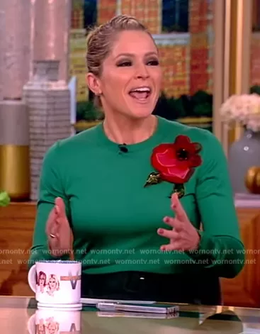 Sara Haines on The View on ABC was spotted wearing this green floral applique sweater on The View on Feb 02 2024's episode. Sara's Sweater is the Silk Knit Sweater with Floral Applique Detail by Dolce & Gabbana.