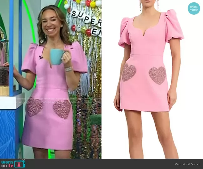 on Today on NBC was spotted wearing this pink heart embellished mini dress on Today on Feb 02 2024's episode. 's Dress is the Rochelle Puff-Sleeve Minidress by Rebecca Vallance.