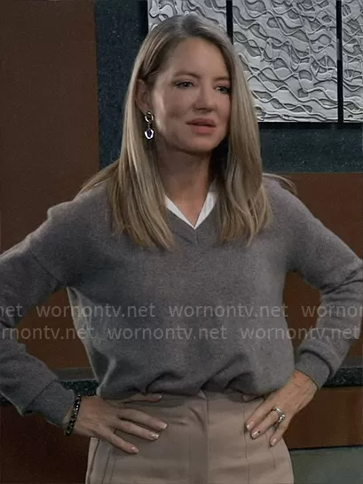Nina Reeves (played by Cynthia Watros) on General Hospital on ABC was spotted wearing this taupe layered v-neck sweater on General Hospital on Feb 05 2024's episode. Nina's Sweater is the Layered Look Cashmere Sweater in Heather Rye Sesame by C by Bloomingdales.