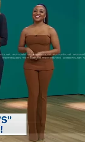 on Good Morning America on ABC was spotted wearing this brown strapless top and pants on Good Morning America on Feb 05 2024's episode. 's Top is the Astrid Strapless Top by Veronica Beard . 's Pants is the Orion Crepe Pants by Veronica Beard.
