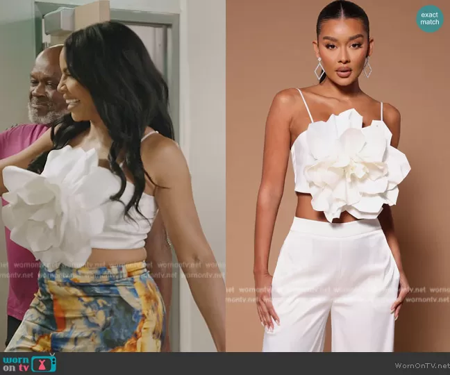 Mia Thornton on The Real Housewives of Potomac on Bravo was spotted wearing this white floral crop top and printed pants on The Real Housewives of Potomac on episode 'Blazed and Confused' (8x12) in Feb 2024. Mia's Top is the Rosalia Flower Pant Set by Fashion Nova . Mia's Pants is the Feeling The Butterflies Pant Set by Fashion Nova.