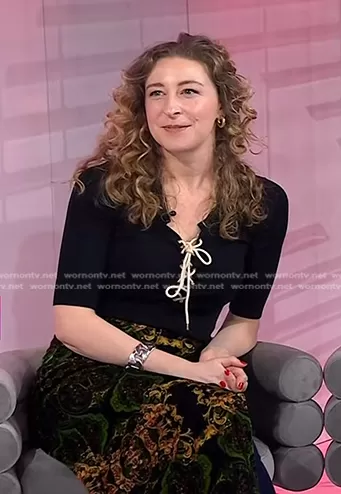 on Today on NBC was spotted wearing this black lace-up top and print skirt on Today on Feb 05 2024's episode. 's Top is the Three-Quarter Sleeve Top by Louis Vuitton . 's Skirt is the Stephine Maxi Skirt by Alice + Olivia.