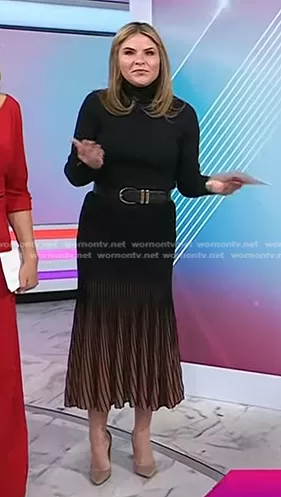 Jenna Bush Hager on Today on NBC was spotted wearing this black striped ombre skirt on Today on Feb 05 2024's episode. Jenna's Skirt is the Emilia Pleated Ombré Maxi Sweater Skirt by Ulla Johnson.