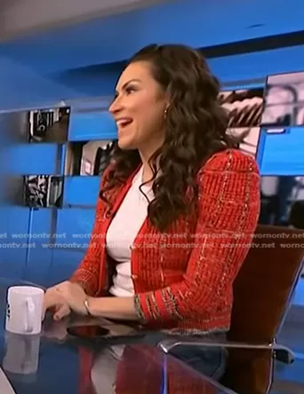 on NBC News Daily on NBC was spotted wearing this red cardigan on NBC News Daily on Feb 05 2024's episode. 's Sweater is the Jenni Cardigan by L'Agence.