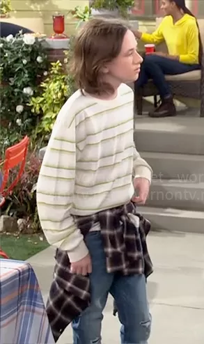 Grover Johnson (played by Hank Greenspan) on The Neighborhood on CBS was spotted wearing this striped t-shirt on The Neighborhood on episode 'Welcome to the Great Beyond' (7x04) in Nov 2024. Grover's Shirt is the Kids' Stripe Long Sleeve T-Shirt in Ivory Dove- Baja Gradient by Treasure & Bond.