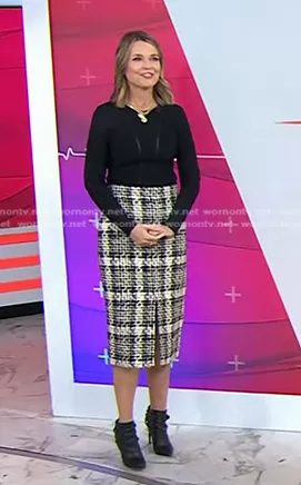 Savannah Guthrie on Today on NBC was spotted wearing this black mesh inset top and plaid pencil skirt on Today on Feb 06 2024's episode. Savannah's Top is the Luminosity Paneled Knit Top by Zimmermann . Savannah's Skirt is the Tweed Pencil Skirt by Alexander McQueen.