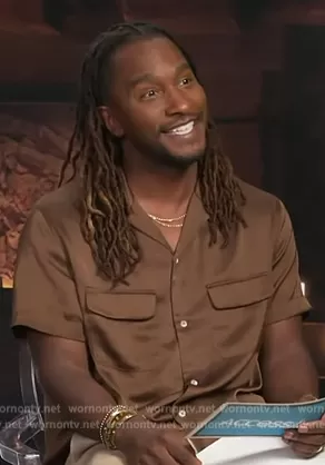 Scott Evans on Access Hollywood on NBC was spotted wearing this brown satin shirt on Access Hollywood on Feb 13 2024's episode. Scott's Shirt is the Short Sleeve Satin Button-Up Bowling Shirt by Elwood.