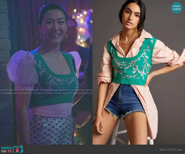 Sumi (played by Kara Wang) on Good Trouble on Freeform was spotted wearing this green cropped vest and puff sleeve top on Good Trouble on episode 'One Way or Another' (5x16) in Feb 2024. Sumi's Top is the Denise Sweater Crop Top by Maeve . Sumi's Top is the Abella Puff-Sleeve Knit Blouse by Alice + Olivia . Sumi's Pants is the High Waisted Straight Leg Pants in pink heart jacquard by Glamorous.