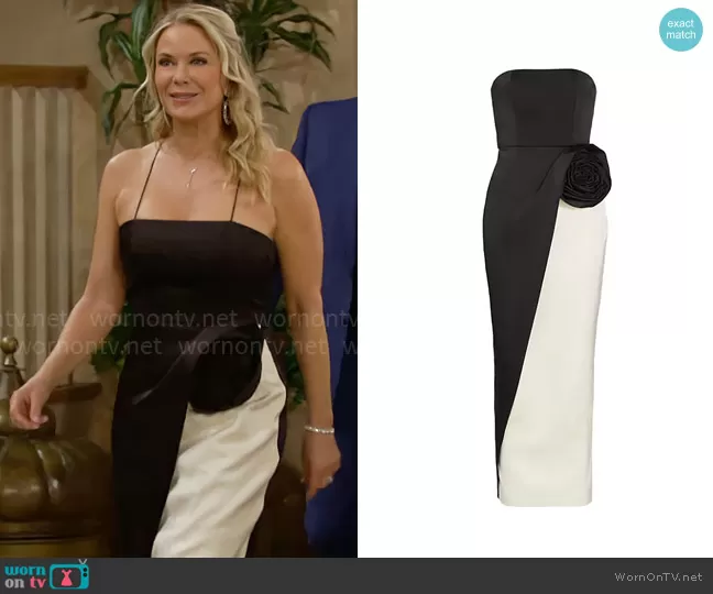 Brooke Logan (played by Katherine Kelly Lang) on The Bold and the Beautiful on CBS was spotted wearing this black and white rosette dress on The Bold and the Beautiful on Feb 07 2024's episode. Brooke's Dress is the Pradova Dress by Ronny Kobo .