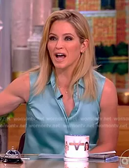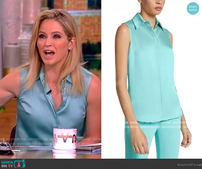 Sara Haines on The View on ABC was spotted wearing this blue satin sleeveless shirt and pants on The View on Feb 07 2024's episode. Sara's Top is the Hansen Charmeuse Sleeveless Shirt by Michael Kors Collection . Sara's Pants is the Haylee Flare Crepe Trousers by Michael Kors Collection .