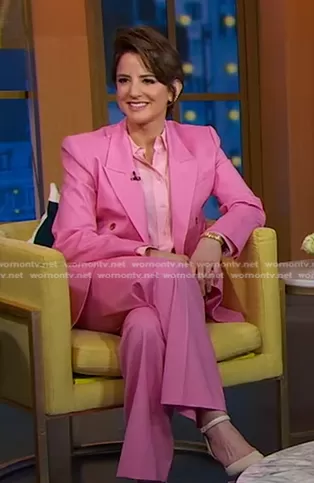 on Good Morning America on ABC was spotted wearing this Rachel Simmons’ pink suit on Good Morning America on Feb 07 2024's episode. 's Jacket is the Double Breasted Stretch Wool Blazer in Bubblegum by Argent . 's Pants is the Stretch Wool Wide Leg Trousers in Bubblegum by Argent.