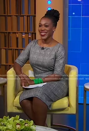 on Good Morning America on ABC was spotted wearing this grey plaid dress on Good Morning America on Feb 07 2024's episode. 's Dress is the Glen Plaid Short Sleeve Sheath Dress by Maggy London.