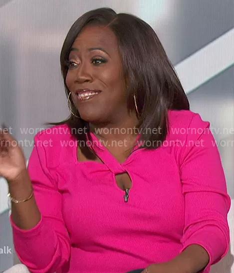 Sheryl Underwood on The Talk on CBS was spotted wearing this pink twist neck top on The Talk on Feb 07 2024's episode. Sheryl's Top is the Cutout Ribbed Top by INC International Concepts.