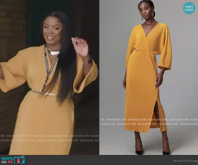 Ava Coleman (played by Janelle James) on Abbott Elementary on ABC was spotted wearing this yellow knit wrap dress on Abbott Elementary on episode 'Career Day Part 1' (3x01) in Feb 2024. Ava's Dress is the Plisse V-Neck Wrap Midi Dress by Anthropologie.