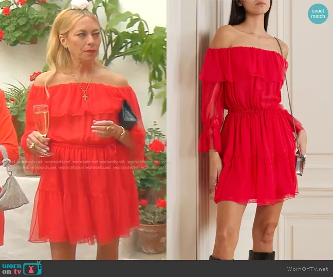 Sutton Stracke on The Real Housewives of Beverly Hills on Bravo was spotted wearing this red off-shoulder chiffon mini dress on The Real Housewives of Beverly Hills on episode 'Ashing It Out' (13x15) in Feb 2024. Sutton's Dress is the Chiffon Mini Dress by Gucci.