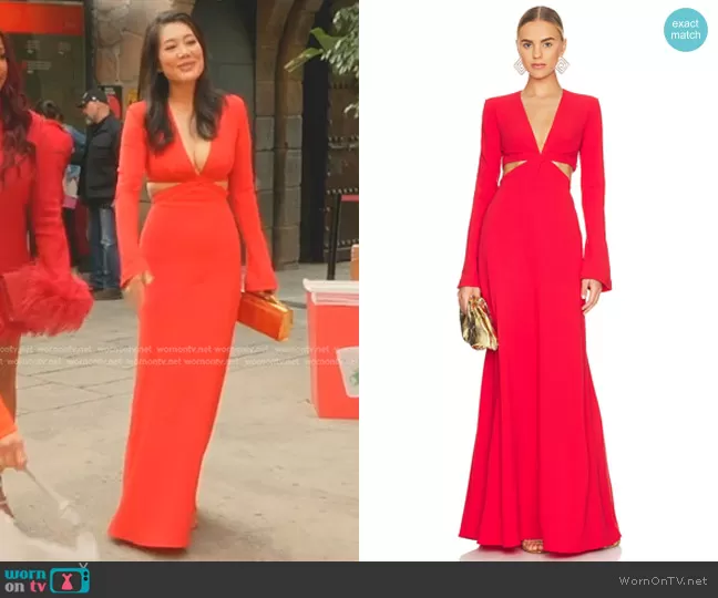 Crystal Kung Minkoff on The Real Housewives of Beverly Hills on Bravo was spotted wearing this red cutout maxi dress on The Real Housewives of Beverly Hills on episode 'Ashing It Out' (13x15) in Feb 2024. Crystal's Dress is the Issa Dress by A.L.C..