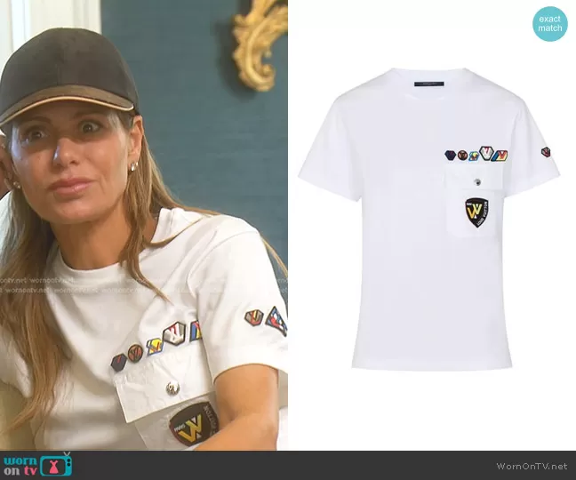 Dorit Kemsley on The Real Housewives of Beverly Hills on Bravo was spotted wearing this white patch pocket tee and baseball cap on The Real Housewives of Beverly Hills on episode 'Ashing It Out' (13x15) in Feb 2024. Dorit's Top is the Cotton Patched Pocket Detail T-Shirt by Louis Vuitton . Dorit's Hat is the LV Get Ready Cap by Louis Vuitton.