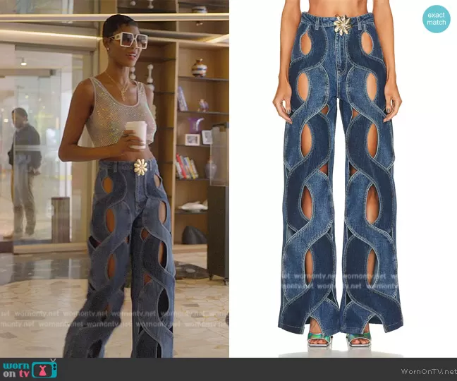 Kiki Barth (played by Kiki Barth) on The Real Housewives of Miami on Peacock was spotted wearing this denim braided jeans on The Real Housewives of Miami on episode 'Get Me Off This Gondola!' (6x15) in Feb 2024. Kiki's Pants is the Rope Cutout Wide Leg Pant by Area . Kiki's Sunglasses is the 30Montaigne SU oversized sunglasses by Dior.