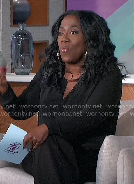Sheryl Underwood on The Talk on CBS was spotted wearing this black keyhole blouse on The Talk on Feb 08 2024's episode. Sheryl's Top is the Hardware Keyhole Top by INC International Concepts.