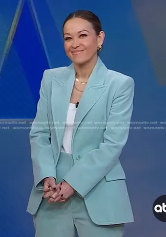 Eva Pilgrim on Good Morning America on ABC was spotted wearing this mint velvet suit on Good Morning America on Mar 26 2024's episode. Eva's Jacket is the Velvet Jacket in Mint by Scanlan Theodore . Eva's Pants is the Velvet Trouser in Mint by Scanlan Theodore.