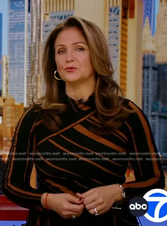 on Good Morning America on ABC was spotted wearing this black striped dress on Good Morning America on Feb 09 2024's episode. 's Dress is the Asymmetrical Striped Dress by Taylor.