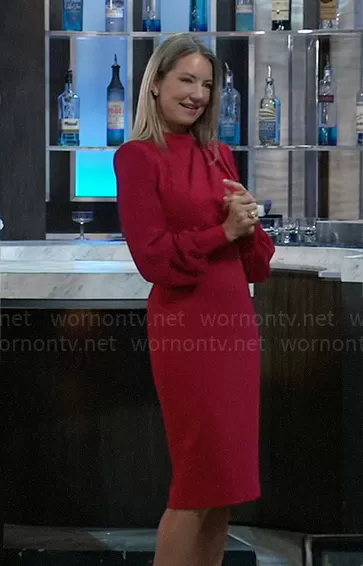 Nina Reeves (played by Cynthia Watros) on General Hospital on ABC was spotted wearing this red draped long sleeve sheath dress on General Hospital on Feb 23 2024's episode. Nina's Dress is the Twist Mock-Neck Georgette-Sleeve Midi Dress by Badgley Mischka Collection .