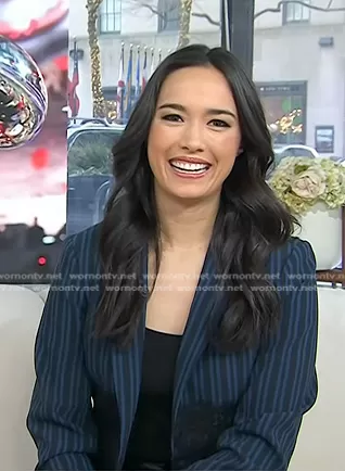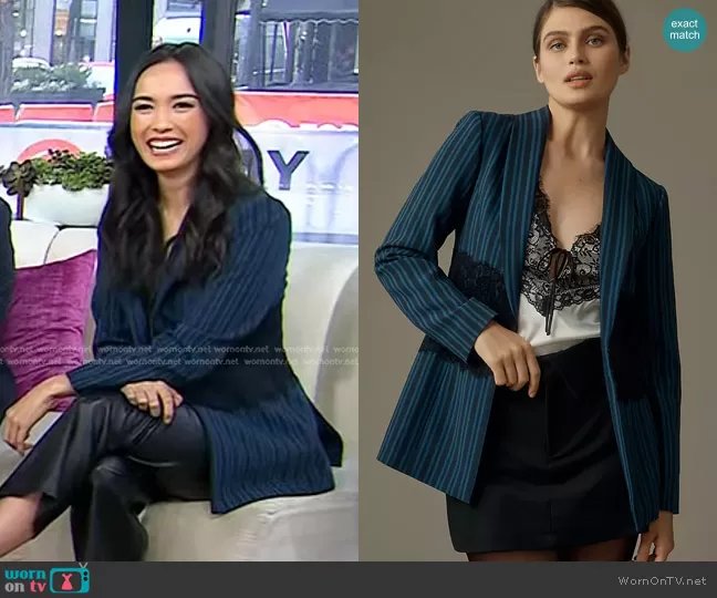 Emilie Ikeda on Today on NBC was spotted wearing this lace-waist striped blazer on Today on Feb 12 2024's episode. Emilie's Jacket is the Lace Mix Pinstripe Blazer by Maeve.