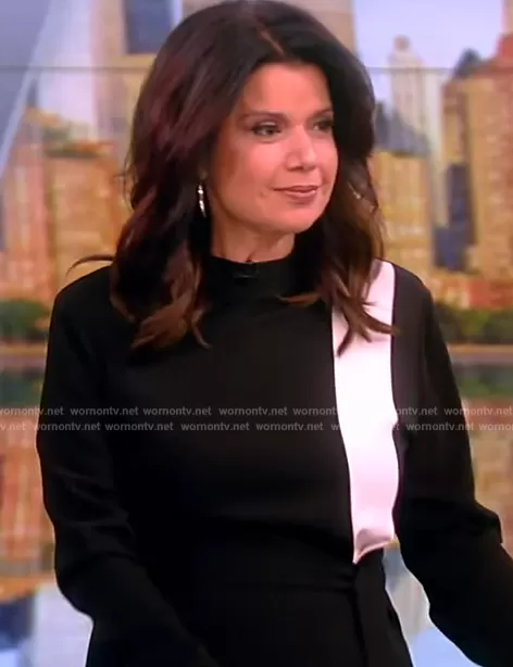 Ana Navarro on The View on ABC was spotted wearing this black contrast stripe dress on The View on Feb 12 2024's episode. Ana's Dress is the Millie Colorblock Long Sleeve Midi Dress by Reiss.