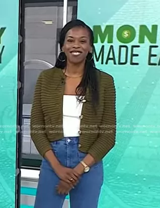 on Today on NBC was spotted wearing this green cardigan on Today on Feb 12 2024's episode. 's Sweater is the Gaspard Pearl-Knitted Cardigan in Khaki by Ba&Sh.