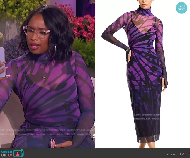 Jennifer Hudson on The Jennifer Hudson Show on FOX was spotted wearing this purple tie dye print mesh dress on The Jennifer Hudson Show on Feb 11 2024's episode. Jennifer's Dress is the Shailene Turtleneck Bodycon Midi Dress by AFRM.