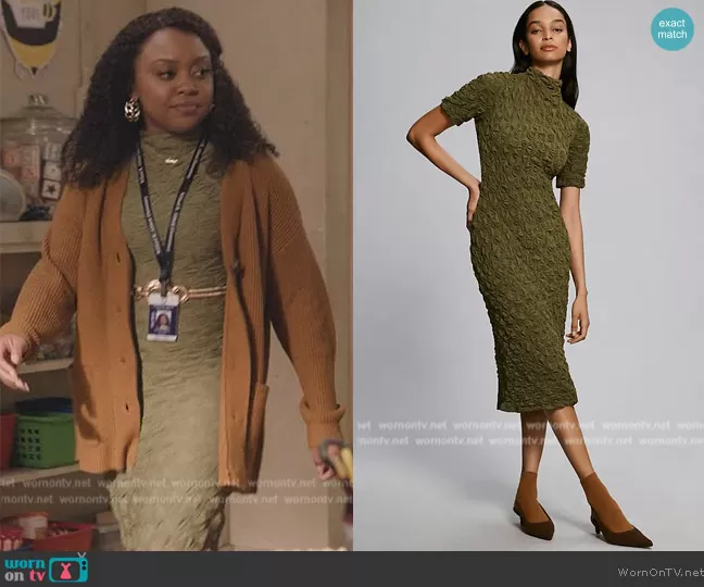 Janine Teagues (played by Quinta Brunson) on Abbott Elementary on ABC was spotted wearing this green textured long sleeve dress on Abbott Elementary on episode 'Career Day Part 1' (3x01) in Feb 2024. Janine's Dress is the Short-Sleeve Scrunch-Textured Midi Dress by Maeve.