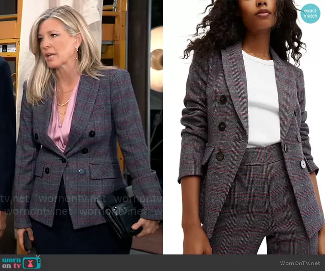 Carly Spencer (played by Laura Wright) on General Hospital on ABC was spotted wearing this grey plaid blazer on General Hospital on Feb 14 2024's episode. Carly's Jacket is the Lawrence Dickey Blazer by Veronica Beard .