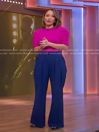 Eva Pilgrim on Good Morning America on ABC was spotted wearing this pink puff sleeve sweater and blue pants on Good Morning America on Feb 14 2024's episode. Eva's Sweater is the Ruched Sleeve Cashmere-Wool Sweater in Magenta by Frame . Eva's Pants is the Polished Stretch Wool Blend Pleated Wide Leg Pants by Karen Millen.