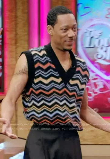 on Live with Kelly and Mark on Disney ABC Home Entertainment was spotted wearing this Tyler James Williams zig-zag vest on Live with Kelly and Mark on Feb 14 2024's episode. 's Vest is the Zig Zag sweater vest by Missoni.