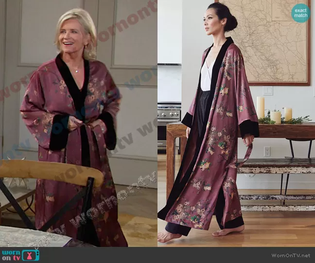 Kayla Brady (played by Mary Beth Evans) on Days of our Lives on Peacock was spotted wearing this velvet trim floral robe on Days of our Lives on Feb 14 2024's episode. Kayla's Robe is the Haruka Kimono Long Wrap in Rosewood by Kim + Ono.