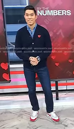 on Today on NBC was spotted wearing this navy heart patch cardigan on Today on Feb 14 2024's episode. 's Sweater is the Heart Logo-Appliqué Wool Cardigan by Comme Des Garçons Play . 's Shoes is the Air Max 1 '86 "Big Bubble - Red" Sneakers by Nike.