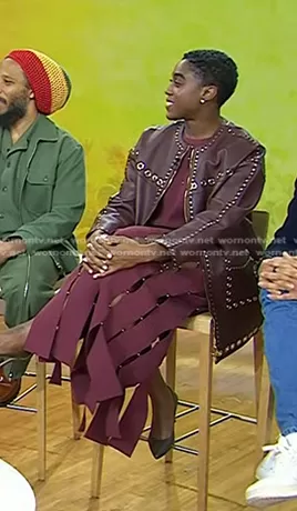 on Today on NBC was spotted wearing this burgundy cutout dress and grommet leather jacket on Today on Feb 14 2024's episode. 's Dress is the Evening Beaded Knit Gown in Cranberry by St. John . 's Coat is the Embellished Doubleface Leather Coat in Dark Cranberry by St. John.